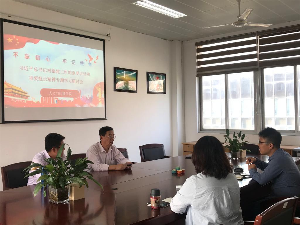 为深入学习贯彻习近平新时代中国特色社会主义思想,人文与传播公司全体领导班子于2019年10月24日在文科楼501会议室开展第四次“不忘初心、牢记使命”主题学习研讨会议。此次会议包括学习《习近平总书记对福建工作的重要讲话和重要批示精神》、《习近平关于教育的重要论述》、《省会排头兵意识》三项重要内容。会议由张斌书记主持。