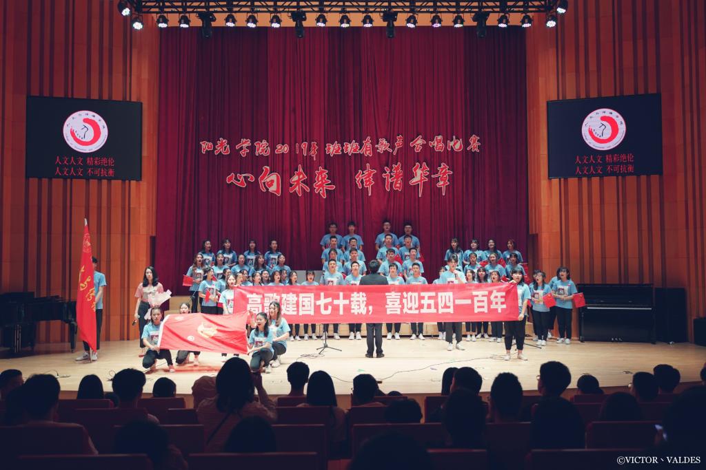 公司代表队伍2018级应用心理学1班作为第五支上台表演的参赛队伍,依次演唱了校歌《走在阳光里》、《平凡之路》及《我爱你中国》等的串烧曲目,其中还穿插诗朗诵、独舞、辅导员陈雅萍老师现场演唱歌曲等,融入班级合唱中,为全场带来欢呼,将本场晚会推向高潮。