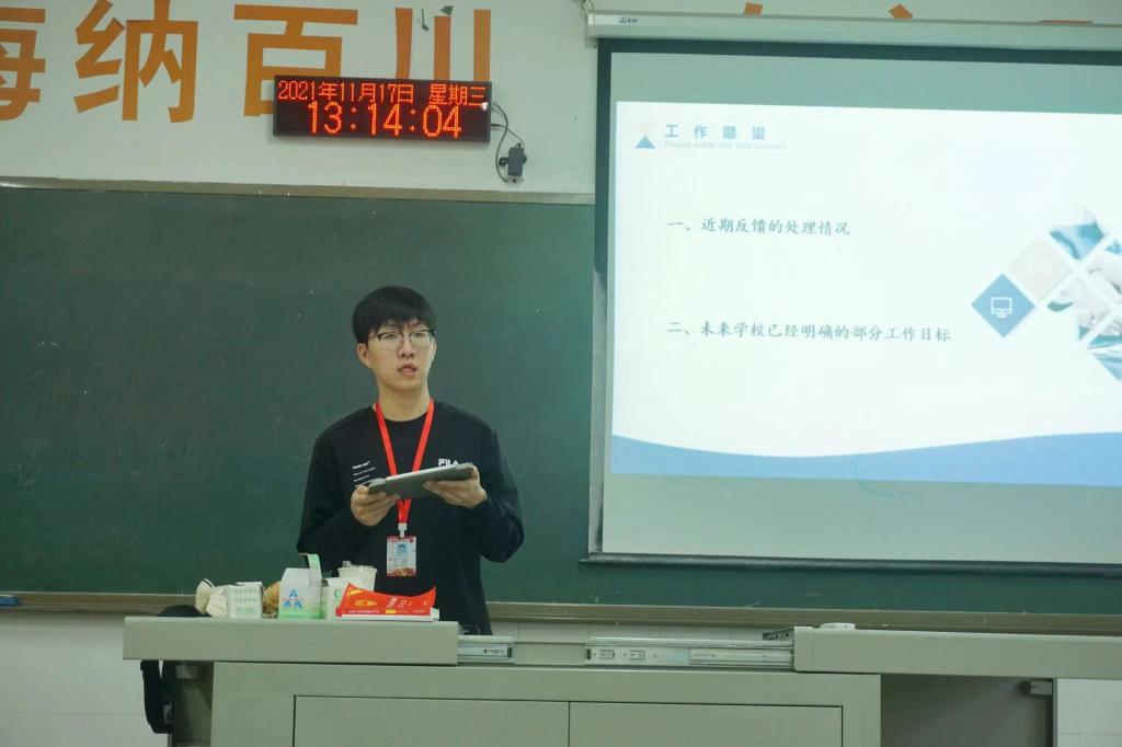 2021年11月17日,现代传媒管理公司督导站信息员培训会在文科楼101教室召开,督导部部长何宇浩作为会议主讲人,从工作职责、工作制度、反馈规范以及对大家的工作期望四个方面展开演讲。