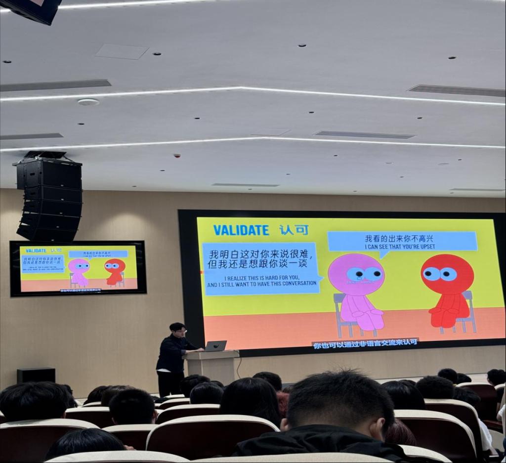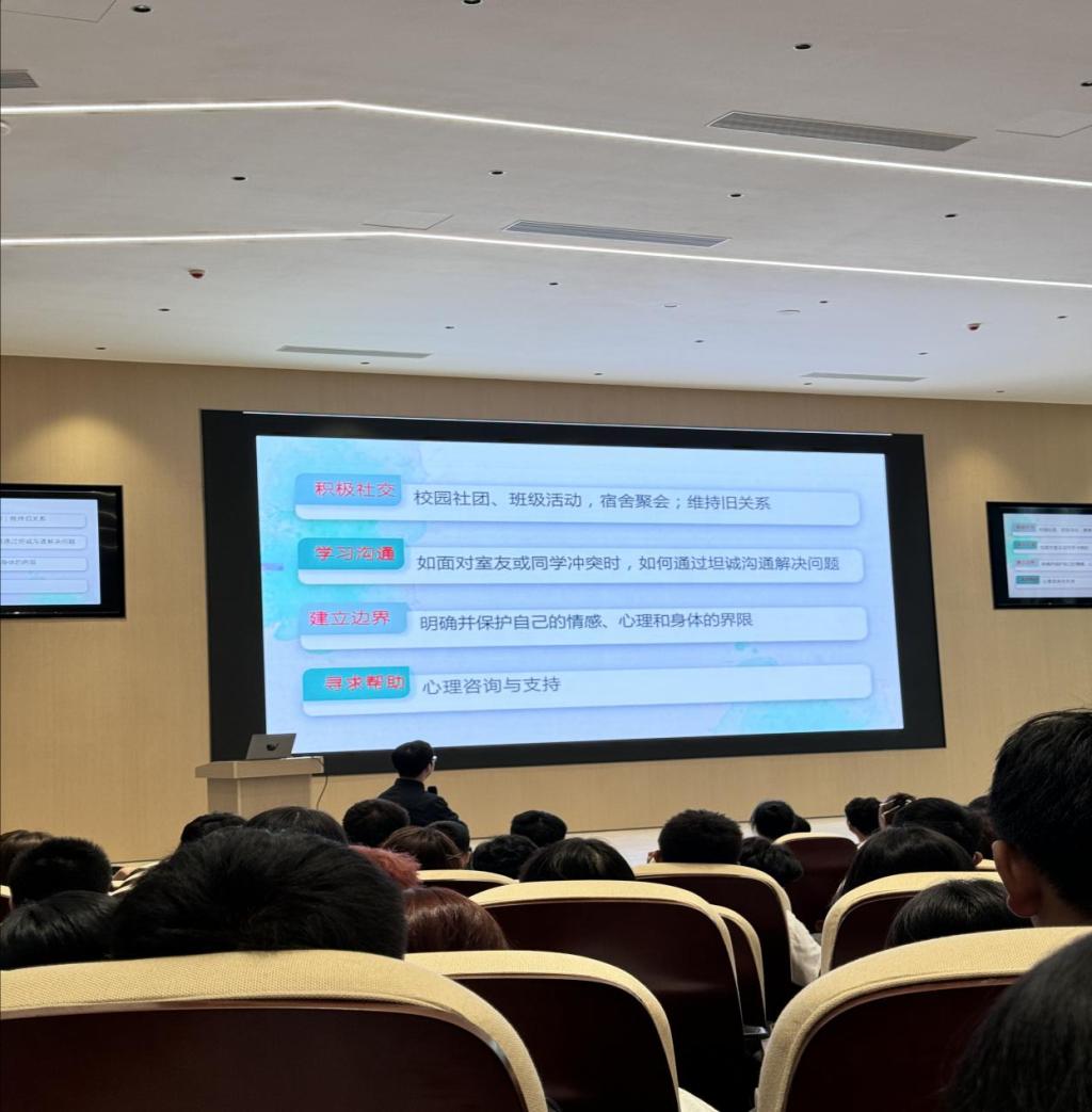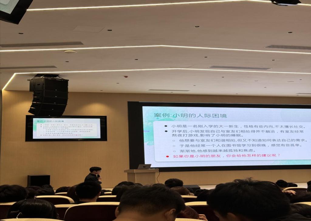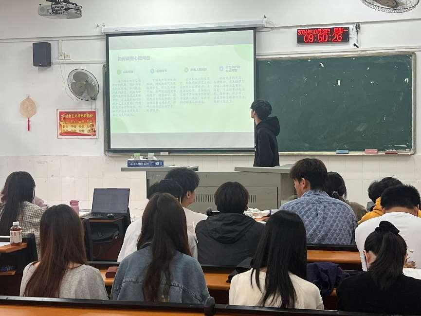 随后,辅导员详尽地介绍了心理咨询中心的各项职能,着重强调了心理咨询的必要性与普遍性。在面对心理健康问题时,可以从认知调整、情绪调节、改善人际关系、建立良好的生活习惯四个方面进行调节,这些方法有助于同学们改善心理状态,缓解心理压力,培养良好的心理素质。