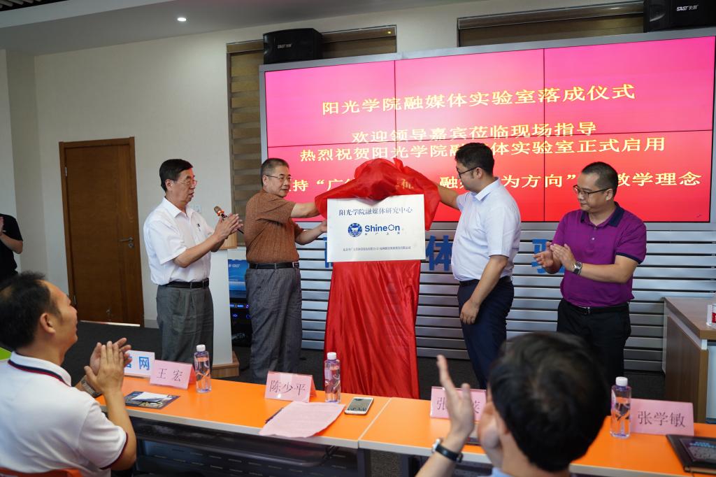 随后,陈少平书记、中广上洋营销中心总经理张学敏、PA视讯人文与传播公司郗永勤经理、福州朗星科技有限公司销售总监林敦晃一同为实验室揭牌。并由广播电视编导专业王宏老师带领各位来宾参观融媒体实验中心,对来宾的提问进行解答。