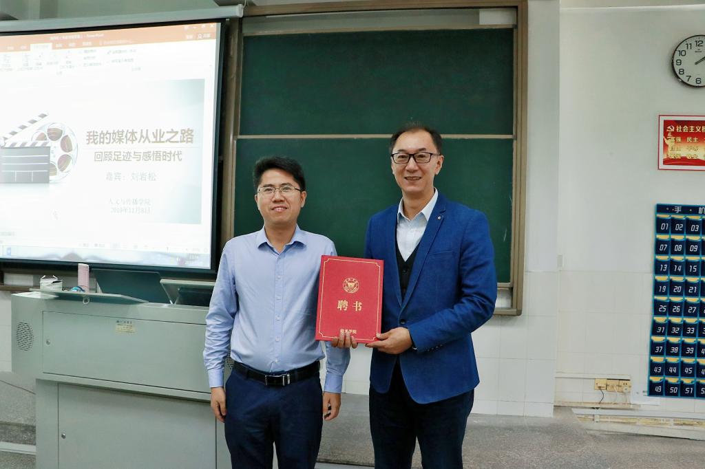 讲座结束,公司副经理张其春教授为刘岩松主编颁发了客座教授聘书。通过此次讲座,同学们不仅更为深刻的认识到了新闻媒体人的工作模式,也了解了在当下这个拥有好机遇的好时代里,在激烈的工作竞争中的,同学们应该在这大学四年里培养自己的心性,向成为一个独一无二的优秀新闻工作者逐渐靠拢。