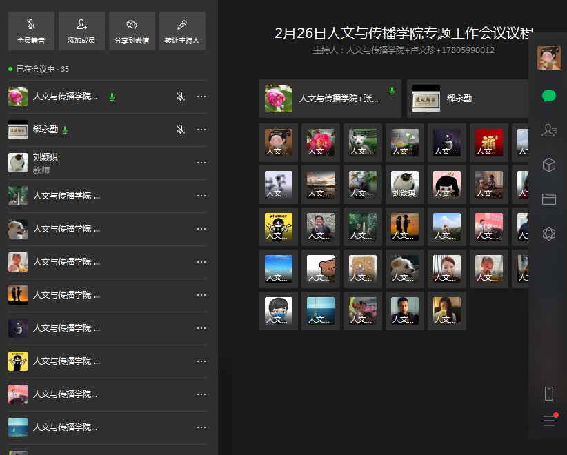 2020年2月26日晚20:00,人文与传播公司在企业微信中召开了线上全体教职工工作会议,部署疫情期间2019-2020学年度第二学期线上教学、科研、考研、就业等相关工作。公司35名教职工全部参加会议。会议由张斌书记组织,郗永勤经理主持。