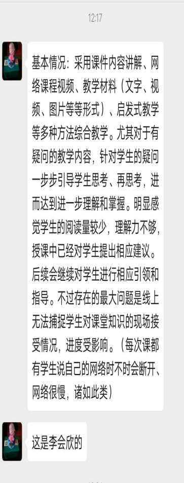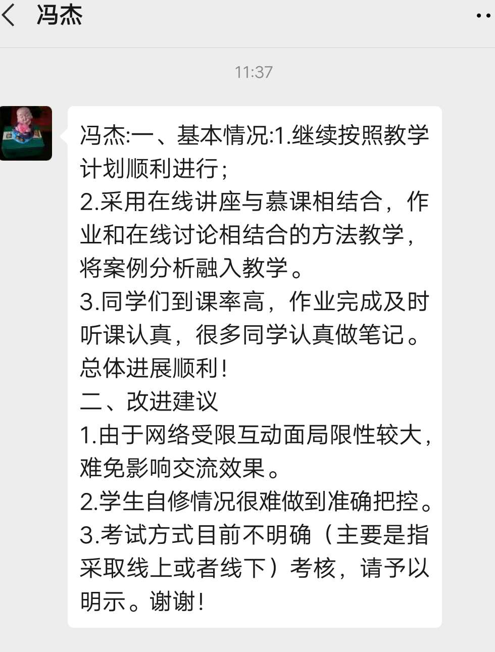 李会欣老师提出要丰富教学资源,采用课件内容讲解、网络课程视频、教学材料(文字、视频、图片等等形式)、启发式教学等多种方法综合教学。为了提升员工学习自律性,段金利老师提出针对一些在家学习不太自律的员工,采用上课时间统一学习通位置签到;为了防止员工走神,积极互动,每隔10分钟会根据当下讲课的内容进行提问,教师根据答案的准确性和及时性来判断员工的上课效率和态度;为了检测员工的上课学习效率和态度,每次课后都布置了上传学习笔记的作业以及有一定难度的作业题。最后大家一致认为:对标两化课程建设,结合线上教学推广契机,积极推进应用型课程建设,进一步提升教学质量,培育应用型人才。