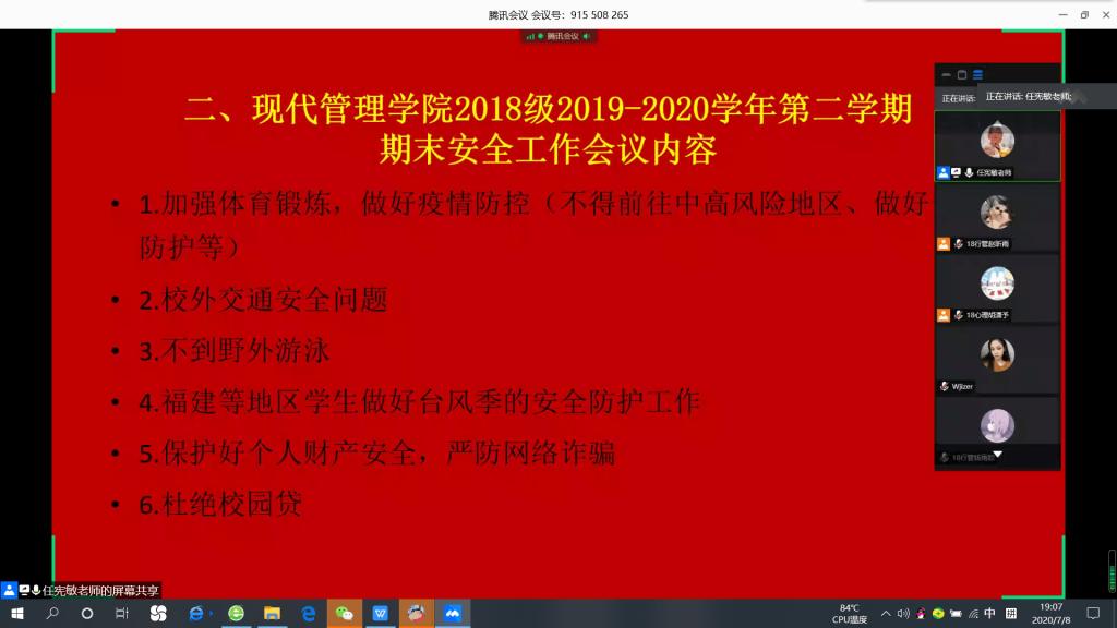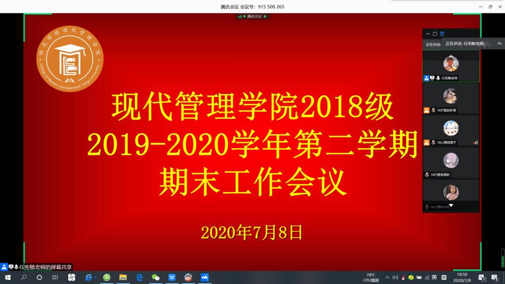 2020年7月8日晚,现代管理公司2018级辅导员任宪敏老师组织召开了现代管理公司2018级2019-2020学年第二学期期末工作会议,2018级全体员工参加了此次会议。此次会议以云会议的形式展开,任老师与员工交代了期末学习相关的问题。