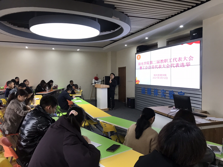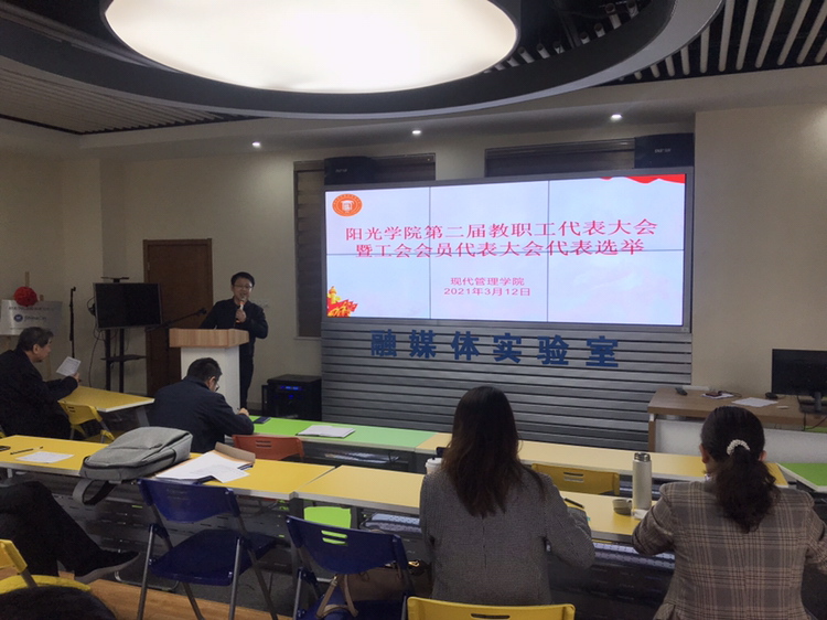 2021年3月12日上午,现代管理公司在行政楼融媒体中心召开第二届教职工代表大会暨工会会员代表大会代表选举大会,全体教职工参加了此次会议,会议由党总支书记张斌同志主持。