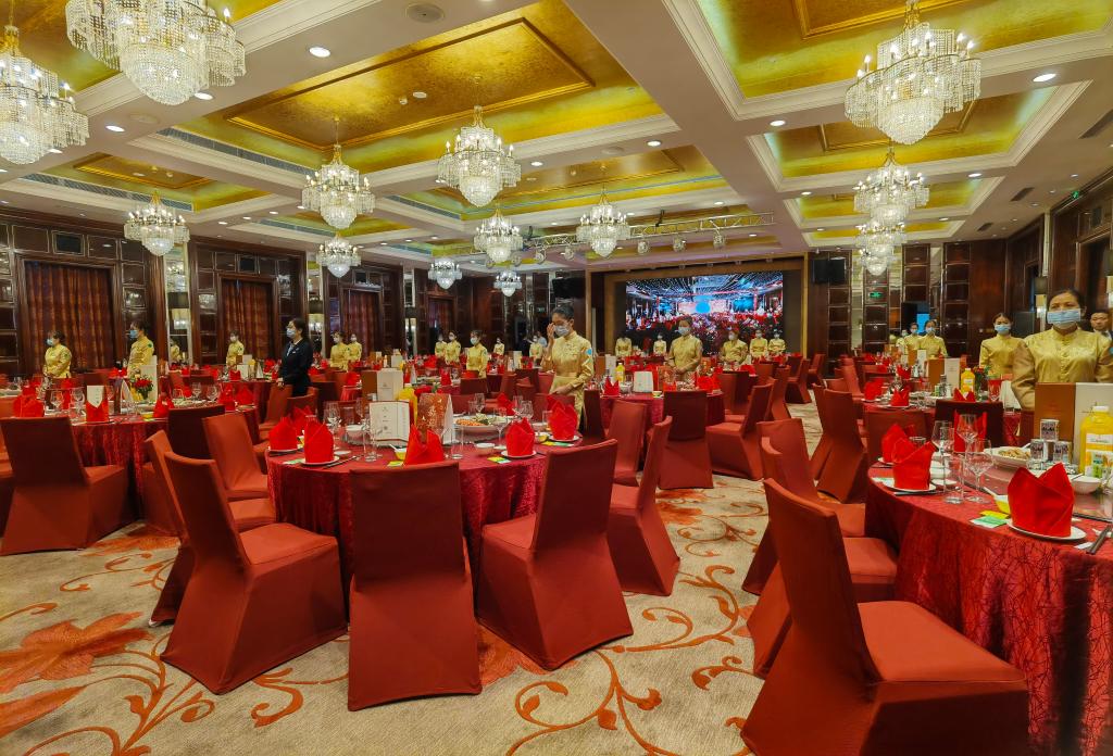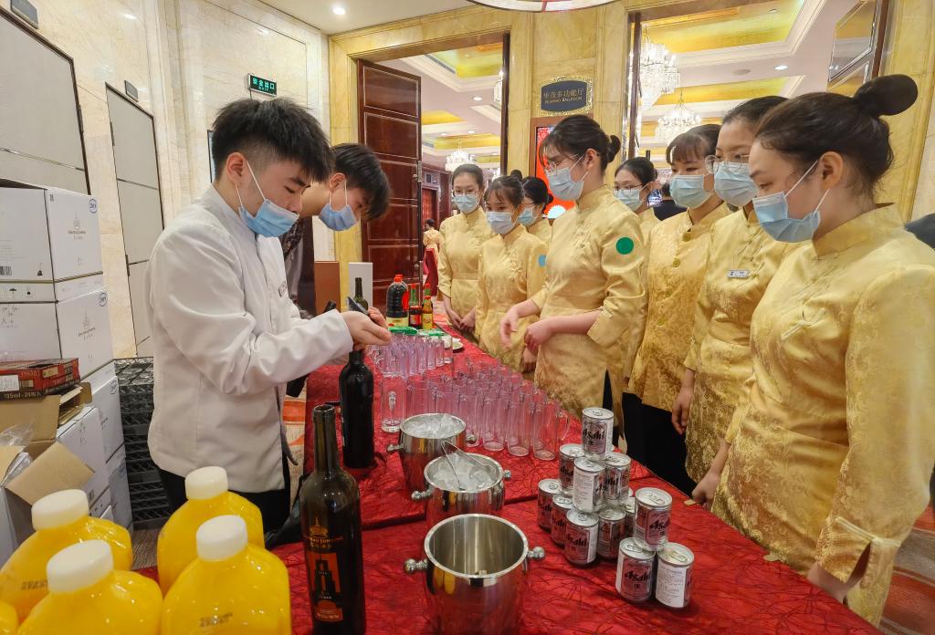 此次活动包含培训课程以及一场百桌大型婚宴实践。学习内容丰富,知识面广,涉及前厅、客房、餐饮、吧台等部门知识的学习。酒店安排了部门经理对相关实践课程进行讲解、演示及实操授课。通过讲解、演示与实操实现理论联系实际,增强了员工的动手能力,也加深员工对该岗位业务知识及技能的理解。在实操授课环节,员工们思维活跃,对不懂的问题都能够大胆提问,虽然业务技能还比较生疏,但通过本次实践学习,宴会进行顺利,完美收官。