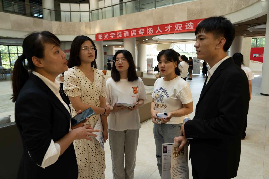 在召开论坛的同时,酒店管理专业专场招聘会在行政楼同时举行。参会的近40余家优质企业为毕业生提供了数百个工作岗位,通过公司宣传海报、发放宣传单、面对面交流等方式就同学们感兴趣的招聘岗位的要求、薪资待遇、个人发展前景等事项与同学们进行了深入全面的沟通。此次参会企业提供的就业岗位与酒店管理专业高度贴合,就业岗位深受毕业生欢迎,部分毕业生在招聘会现场与用人单位达成了初步意向。