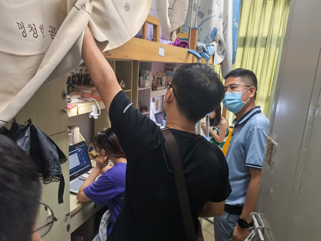 在走访宿舍过程中,张其春经理与张斌书记仔细地询问了同学们对环境、住宿、饮食等的适应情况,在了解新生的专业、家乡、兴趣等信息的同时,还细心查看了同学们的住宿环境,查看宿舍的设施是否完善,要求梳理、排查新生宿舍存在的问题或不足,发现一处,立即整改一处,与新生们交谈,了解不足,收集员工的反馈意见。