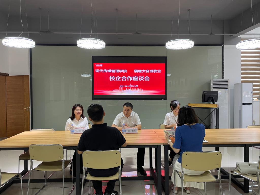 2021年10月15日下午,现代传媒管理公司与福建大名城物业管理有限公司就校企合作在行政楼手工艺实验室进行洽谈,本次座谈会聚焦于双方的校企合作意向确认和具体合作计划。福建大名城物业管理有限公司与会代表为集团人事行政中心总监邱祖旺、人事行政中心人事经理林丽凤、人事行政中心人事经理朱惠云。公司参与本次座谈会的代表为张斌书记、物业管理专业负责人王莉丽老师。