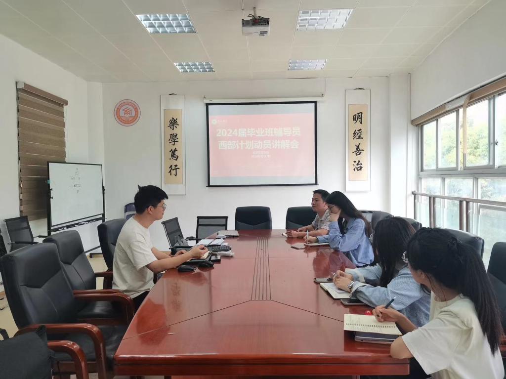 会上,王植老师针对2024年西部计划政策进行宣讲,从项目简介、招募事宜、政策保障、服务管理等多方面进行解读。以往届参加西部计划的员工为例,通过视频、图片的生动形式,讲述他们热血青春、任担当的成长故事。同时,为参会的辅导员现场答疑,鼓励同学们践行时代使命,为西部地区做出贡献,走进基层、走进乡村,夯实乡村振兴成果。