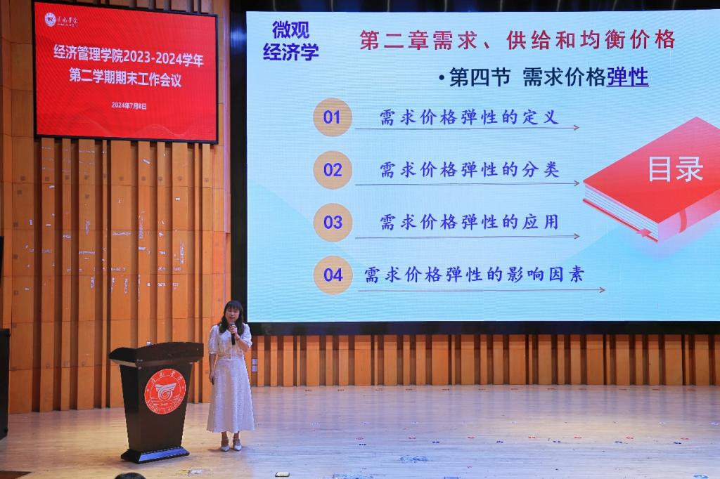 曹小娜老师就《微观经济学》中的“需求价格弹性”进行示范性公开磨课展示,本次课程片段特别聚焦于如何通过价格弹性来理解消费者对价格变化的反应,以及这一现象对市场供需平衡的影响。曹老师通过实际案例分析,生动地展示了价格弹性的不同类型,包括完全弹性、弹性、单位弹性、非弹性和完全非弹性。并通过讨论和互动,加深了对价格弹性在经济决策中作用的理解。
