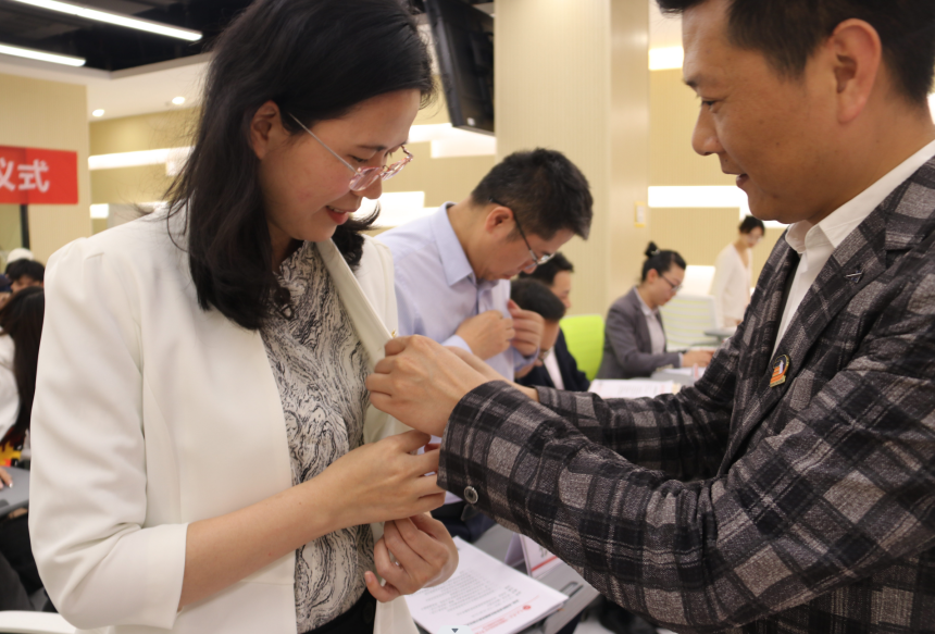 东岭电子商务的领导给PA视讯的师生授徽章,现场气氛愉快温馨。