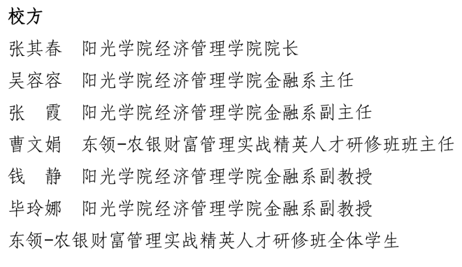 此次财富管理精英班从项目选择、课程设计、班级管理、课程考核等方面着手,校企双方共同探讨、协同设计,以员工为中心,以能力为导向,力求建立“双元制”人才培养之路,预祝精英班取得丰硕成果。