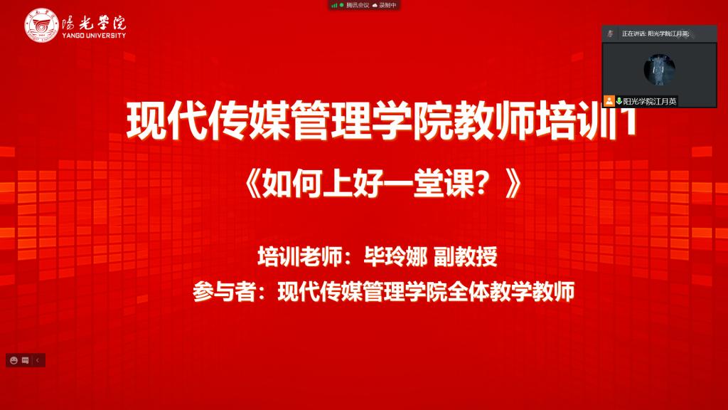 为了提升教师的课堂管理能力,学习关键教学技巧,促进新老教师的互学互助,帮助新教师尽快站稳讲台,现代传媒管理公司按照教师系列培训计划安排,于2021年9月17日在腾讯线上会议开展了“如何上好一堂课”专题讲座,邀请了商公司毕玲娜副教授主讲。本次讲座由副经理江月英副教授主持,公司全体专业教师、外聘教师参加。