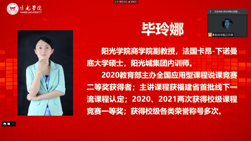 毕玲娜副教授毕业于法国卡昂·下诺曼底大学硕士研究生,现为阳光城集团内训师。曾获得2020教育部主办全国应用型课程说课竞赛二等奖;主讲课程获福建省首批线下一流课程认定;2020、2021两次获得校级课程竞赛一等奖。