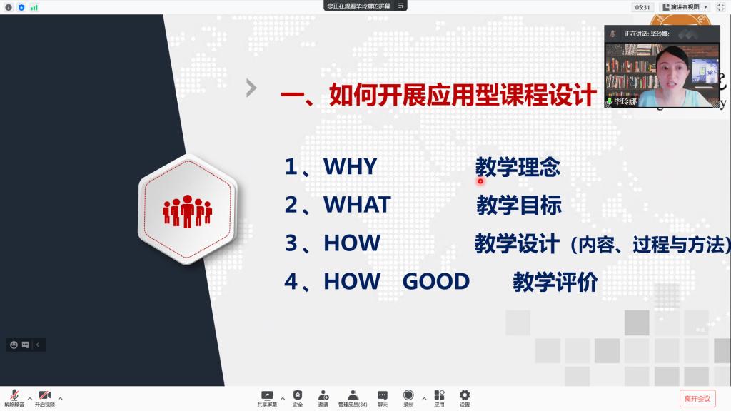 毕老师首先从教学理念、教学目标、教学设计、教学评价四个方面对当下本科应用型课程设计做了精准、凝练的总结。随后对“如何生动地上好一堂课?”这一问题进行了深入刨析,强调授课时将抽象理论具象化,重视课堂互动、激发员工学习兴趣、吸引员工关注课堂,才能保证课堂教学的质量工程能够有效推进。