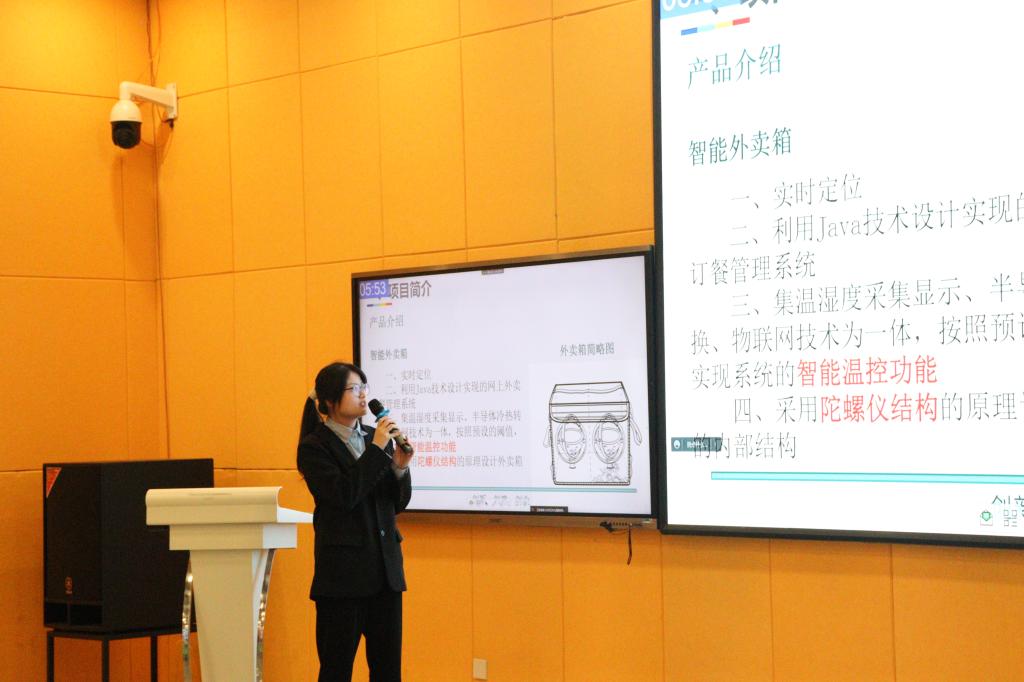 休息片刻后,决赛开幕,各方选手轮流上台,以PPT、视频、展示产品实物等方式为各自的三创项目进行了汇报,PPT内容充分展示了产品或创业项目的特点,重点介绍了创新创意、创业理念、对标的社会热点和行业痛点等方面。同时评委老师们对参赛团队的汇报进行现场点评,关注侧重点聚焦于创业中的老员工们往往难以完全把握的重点、难点,如针对运作模式、项目竞争优势等方面提出了指导性观点以及相关意见,并通过PPT、视频等现场汇报内容对决赛中各小组评定了最终得分成绩。