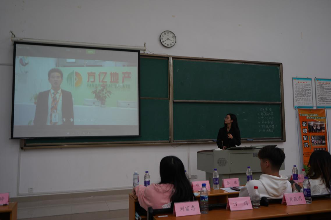 出席本次招聘会的是来自方亿房地产集团的张瑶光、王滢冰以及阮雨婷女士。首先,张瑶光女士介绍了方亿集团的核心理念“履方致远,筑梦同行”,公司为员工提供良好的福利待遇与广阔发展空间,期待更多的优秀人才能够加入集团共同发展。并指出,目前方亿集团的双轨培养计划实行全系列业务培训,将助力应届毕业生步入职场,完成员工到销售精英的转变。公司会进行多维度团队组织管理能力培训与实训,让创富与创业无缝链接。