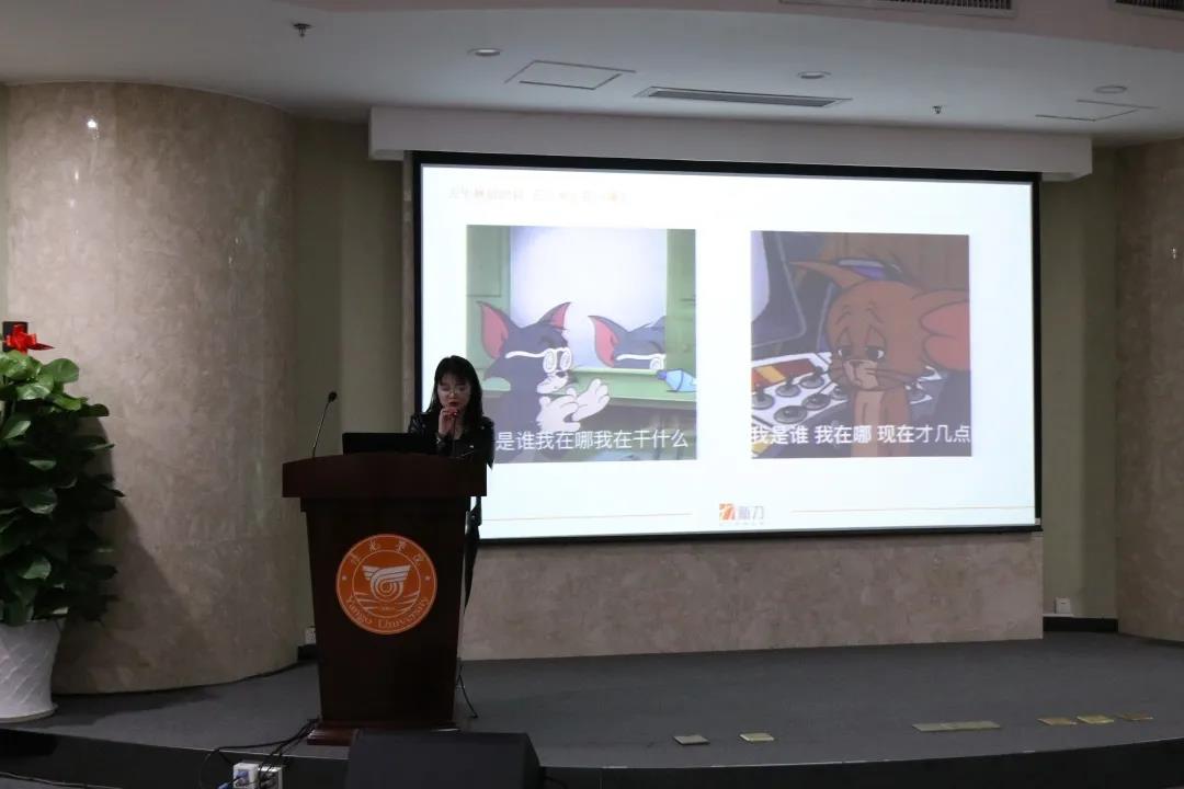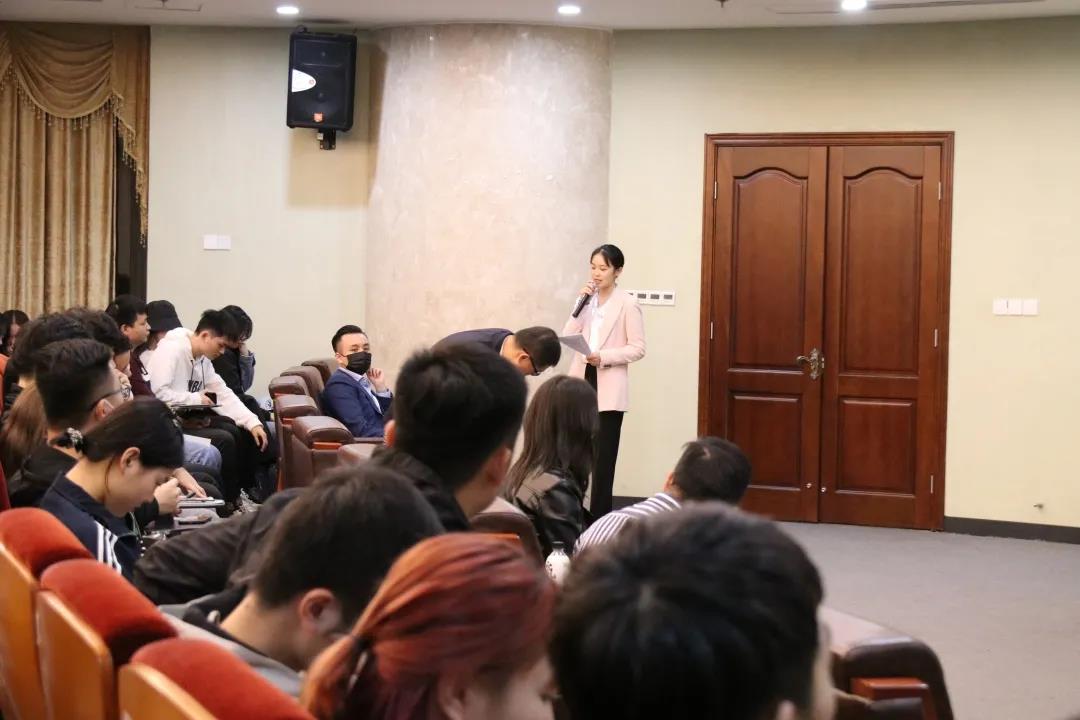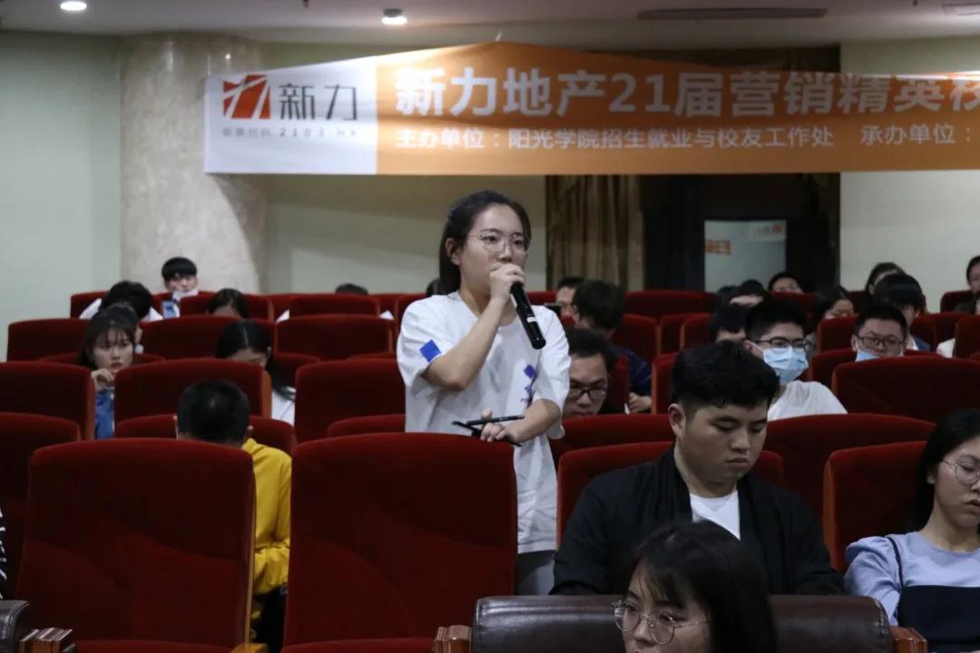接着吴先生通过有奖知识问答发放奖品和面试pass卡,让更多在场的同学参与到游戏当中,活跃了宣讲会现场氛围。再者,新力集团2019年管培生代表珊珊上台,分享自己如何遇见并加入新力集团这个大集体,并在近两年的时间里快速地由“员工党”转为“职业营销人”的经历以及感悟。