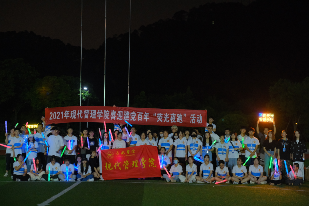 2021年6月10日晚,为庆祝中国共产党成立100周年,弘扬爱国精神,传承青春力量,现代管理公司在东区大操场举行以“百年风华正茂,书写正阳光”为主题的建党百年“荧光夜跑”活动。