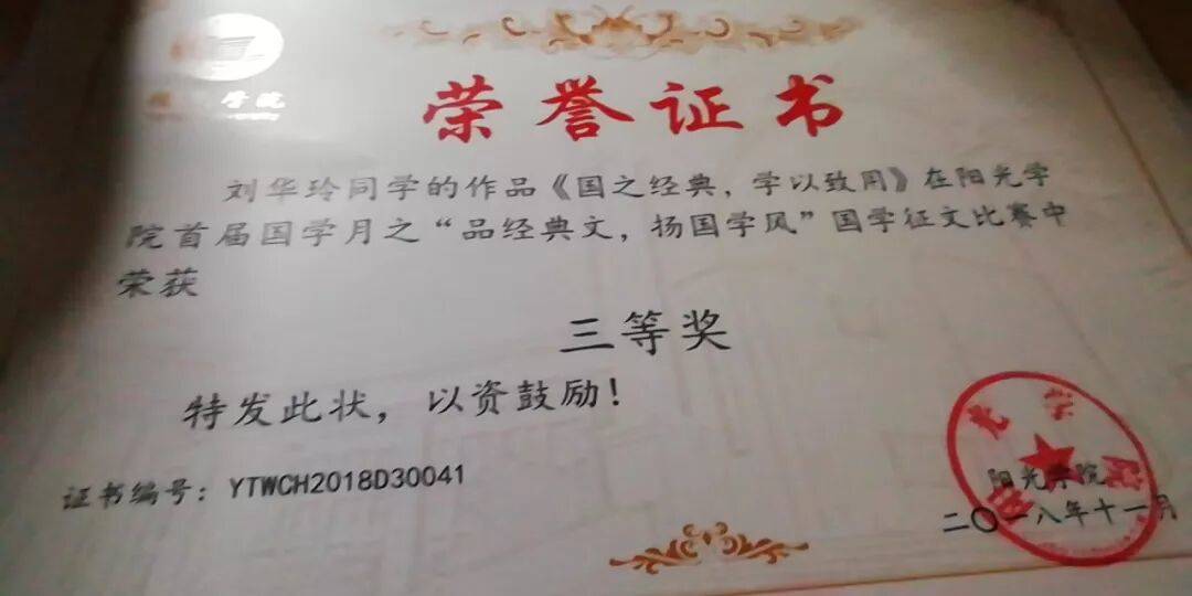 2018年11月荣获PA视讯首届国学月之“品经典文,扬国学风”国学征文比赛三等奖 ;