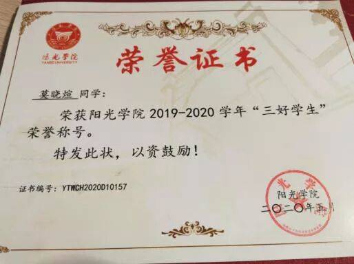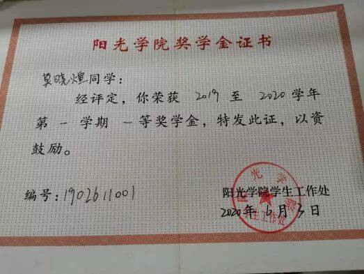2019-2020第二学期获得校“一等奖学金”;