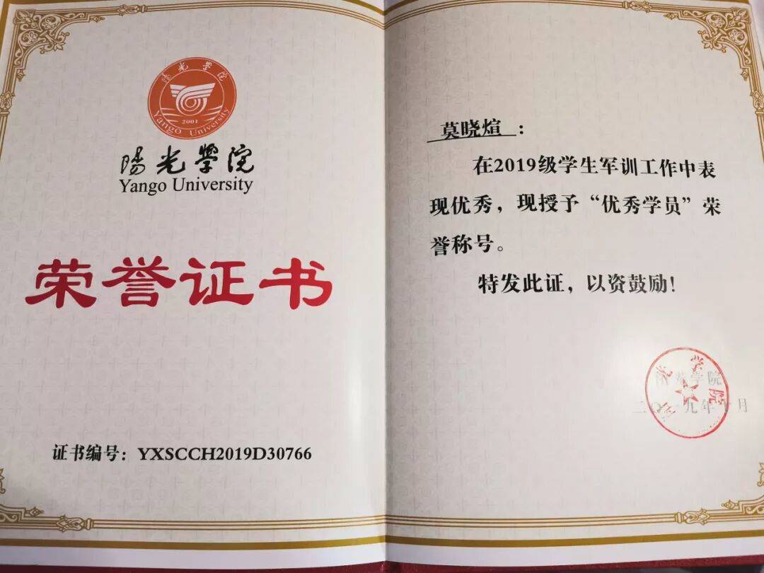荣获2019级员工军训“优秀学员”荣誉称号;