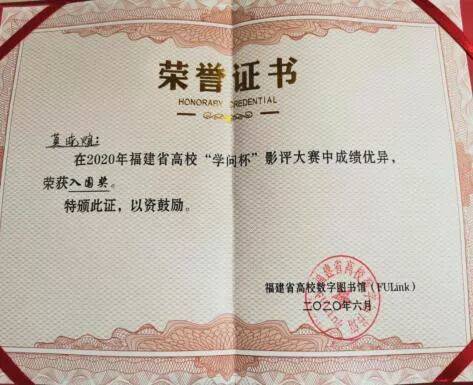 荣获福建省高校学问杯影评大赛“入围奖。