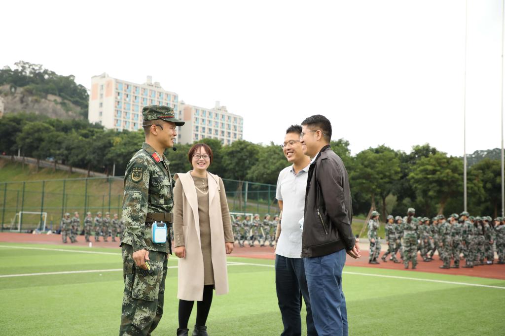 田径场上,张经理与总教官亲切交流,对军训过程中教官的严格训练、带训辅导员的辛勤付出和同学们的刻苦训练表示充分肯定和高度赞扬。他希望各位同学圆满完成各项训练任务,并将军训中收获的体会和精神带入到接下来的大学学习生活中,积极进取、奋勇争先,成为有理想、有担当、有品质、有修养、有追求和有作为的新一代的“六有青年”,让大学的四年青春更加绚丽多彩。