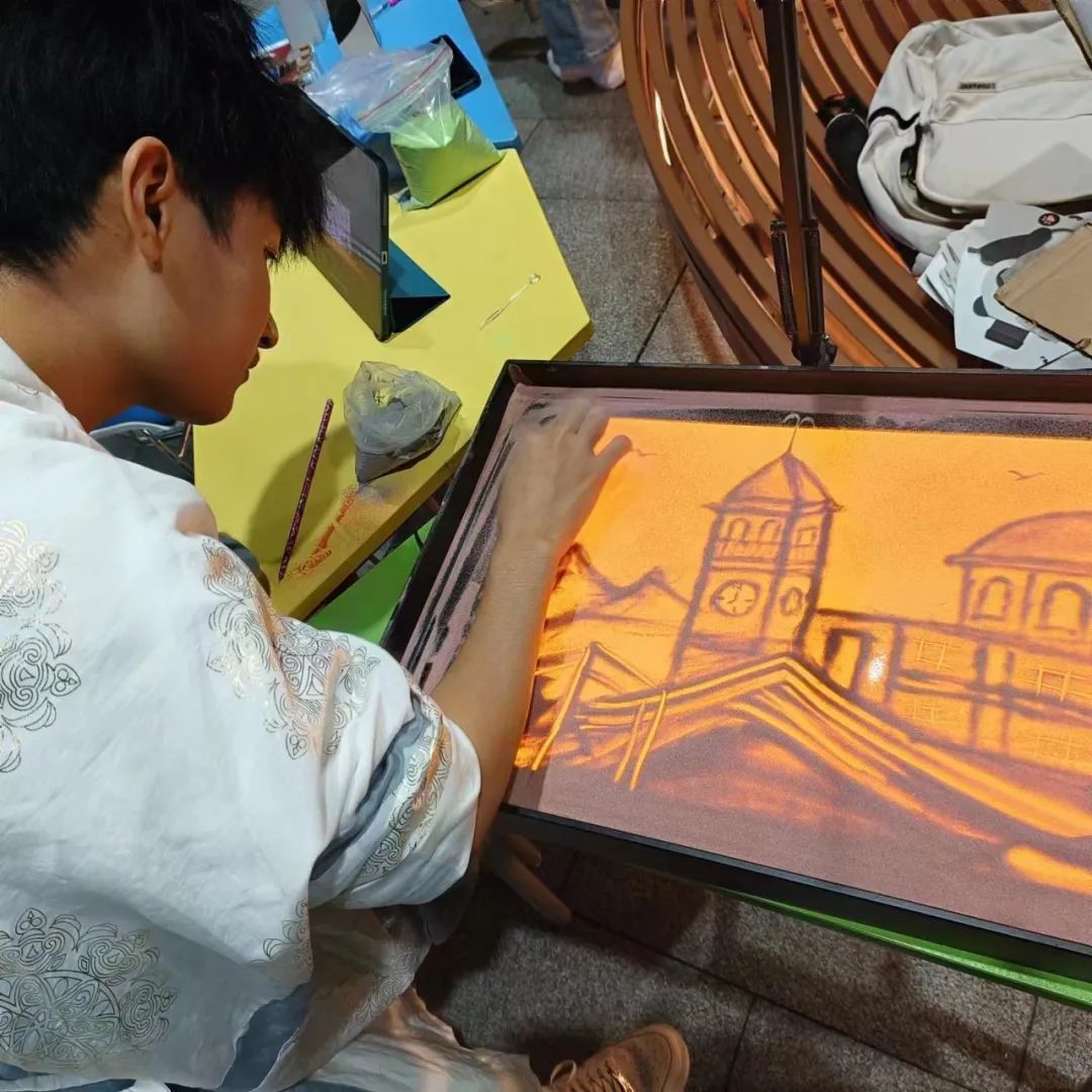2022年秋,黄志伟揣着录取通知书来到PA视讯,来到公司的那一刻,他在心里默默描摹着校园的各个角落,希望能把初见校园时的震撼和触动,转变为令人心动的沙画作品。