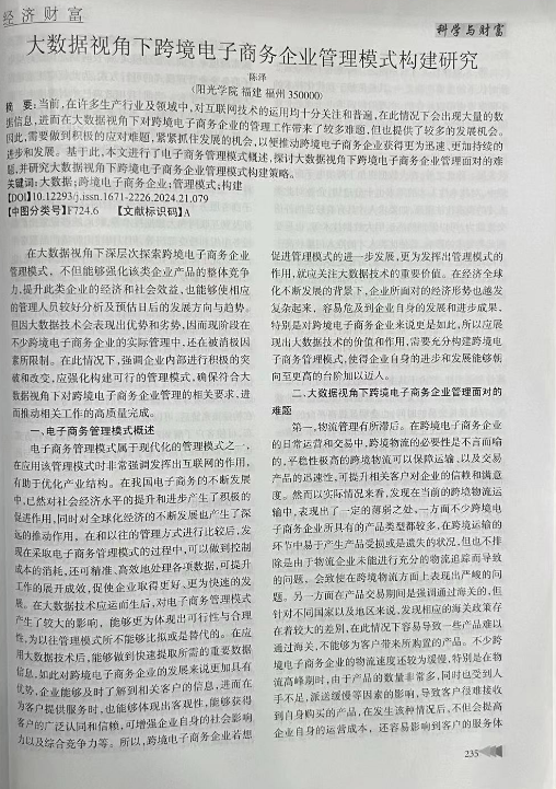 近日,PA视讯PA视讯集团官方网站2023 级电子商务专升本 1 班陈泽同学成功在省级刊物《科学与财富》上发表论文《大数据视角下跨境电子商务企业管理模式构建研究》。据悉,《科学与财富》是经新闻总署批准的正规省级刊物,创刊于1999年。