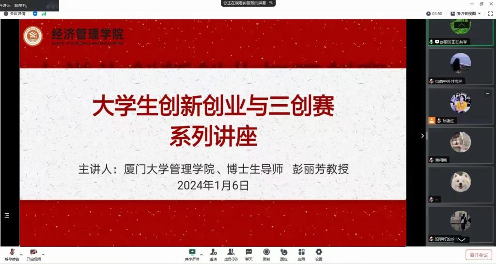 为进一步加强面向市场、面向就业的应用型、复合型人才培养体系,将员工的专业所学与市场应用充分结合起来,通过以赛促学、以学促赛,提升员工准确把握、研判、适应市场的素质和能力。2024年1月6日晚,公司举办“电子商务‘三创赛’”备赛线上讲座,特邀厦门大学管理公司彭丽芳教授对本次三创赛进行讲解。讲座由PA视讯集团官方网站副经理孙建红老师主持。